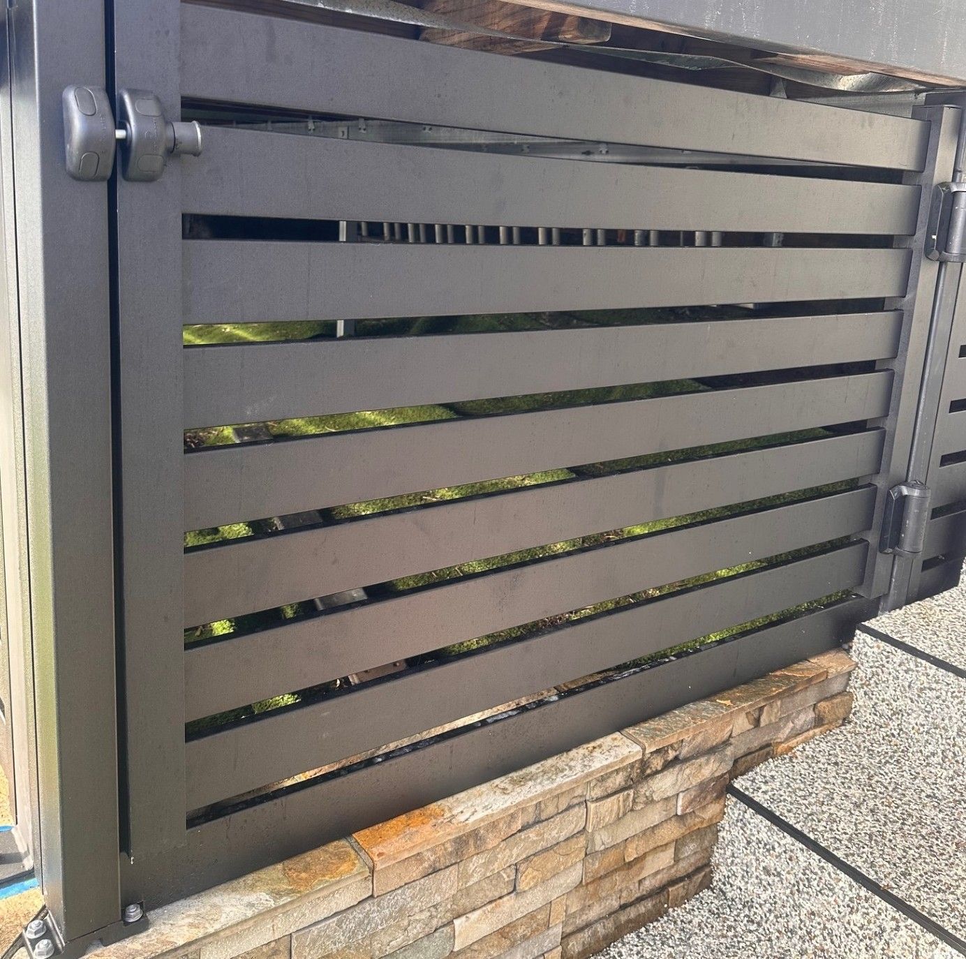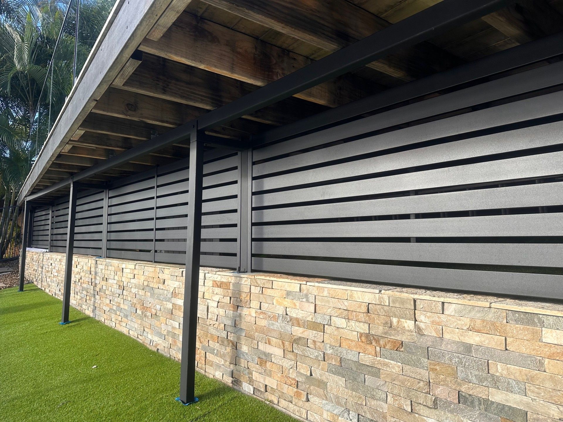 This project features our Black Textura Powdercoat horizontal screen system with 20mm spacings, designed to provide a sleek and modern solution for concealing unsightly areas beneath the client's pool.